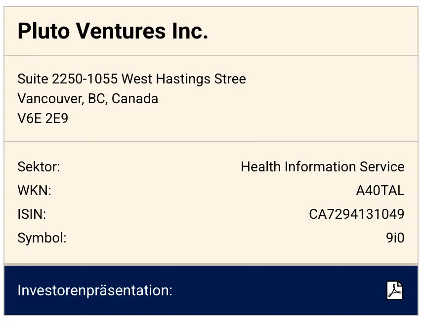 Pluto Ventures (CSE: PLTO | WKN: A40TAL | ISIN: CA7294131049) ist eine Geschichte, die sich in Echtzeit entfaltet. Die Gelegenheit ist zeitgebunden.